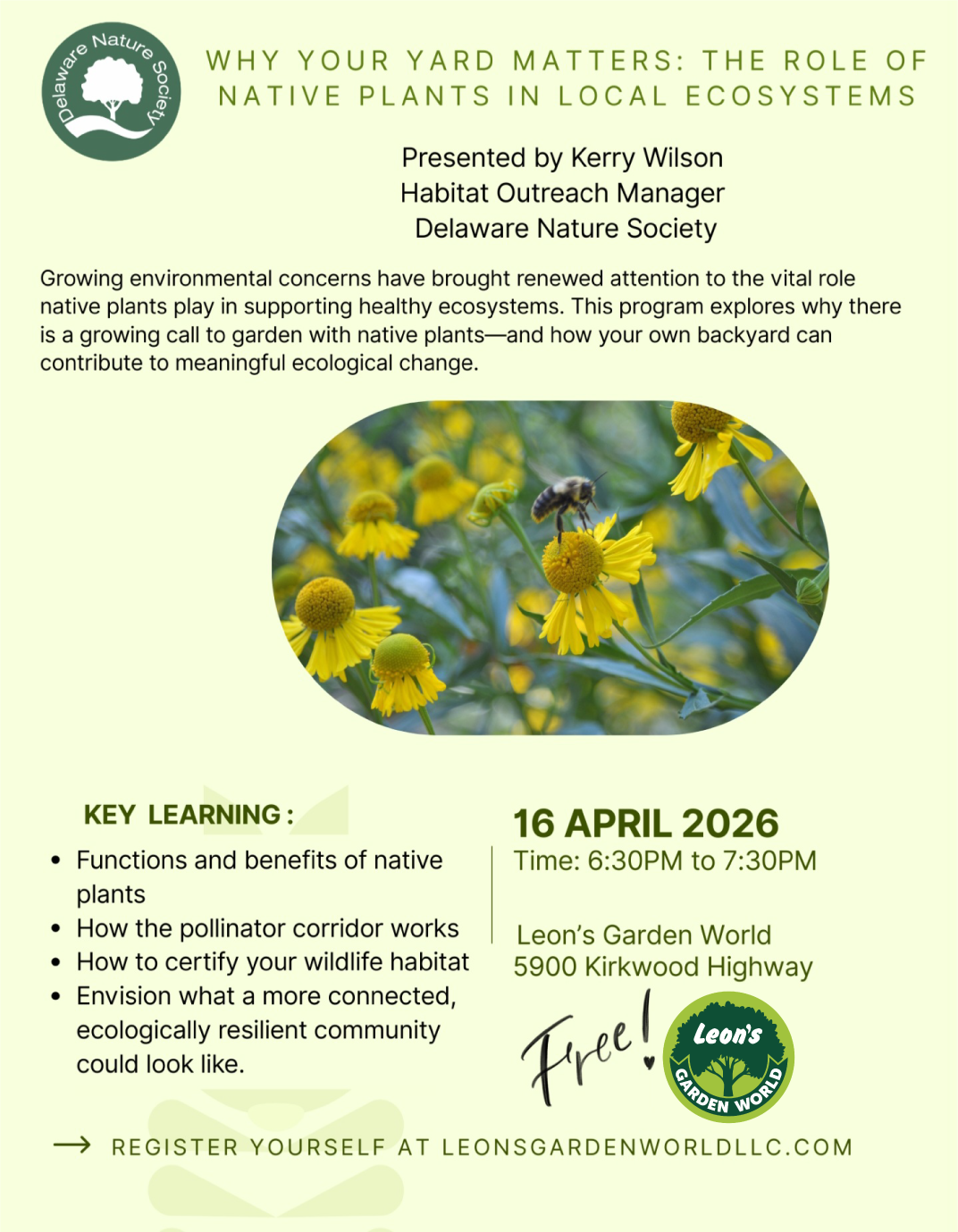 Discover how native plants support healthy ecosystems and why they matter in your own backyard. Join Kerry Wilson, Habitat Outreach Manager with the Delaware Nature Society, for an informative evening exploring how gardeners and homeowners can create landscapes that benefit pollinators, wildlife, and the environment.